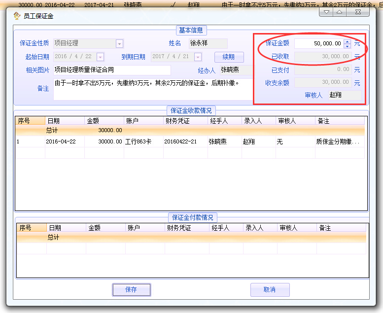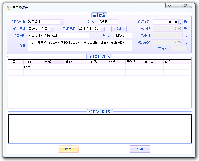 保證金收款通過審核之后,就可以看到已收和應(yīng)交保證金的差距了。(注:若有一天項目經(jīng)理A需要從保證金中扣除質(zhì)量違約金或者項目經(jīng)理A終止與公司的合作而收回保證金,均需要在下面保證金付款情況中登記,直至收支余額=0)