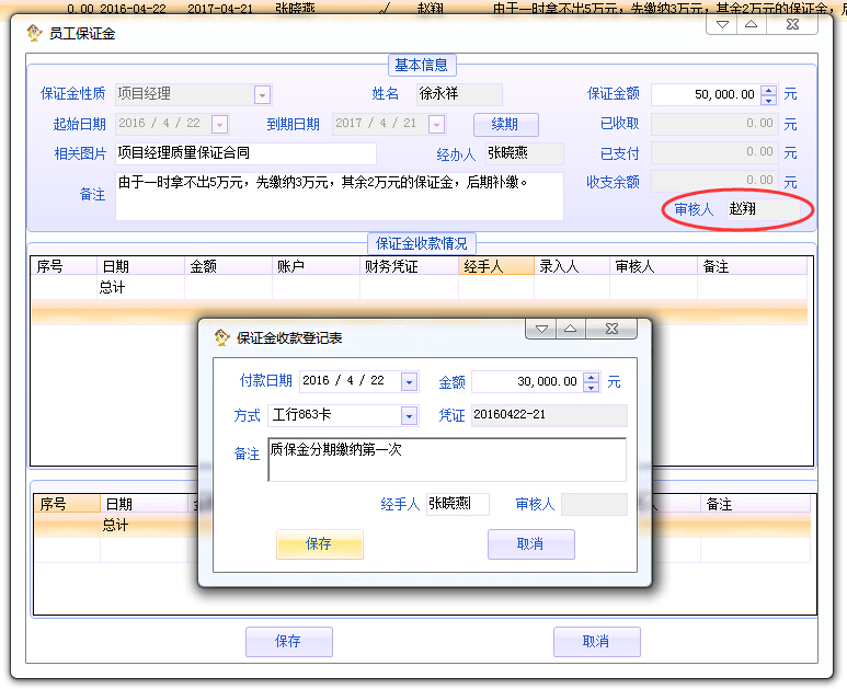 保證金通過審核之后,在保證金收款情況里面點擊添加,將已經(jīng)收的3萬元記錄,然后等待審核通過即可。(注:該保證金收取的費用等審核之后就進入財務(wù)日記賬了)