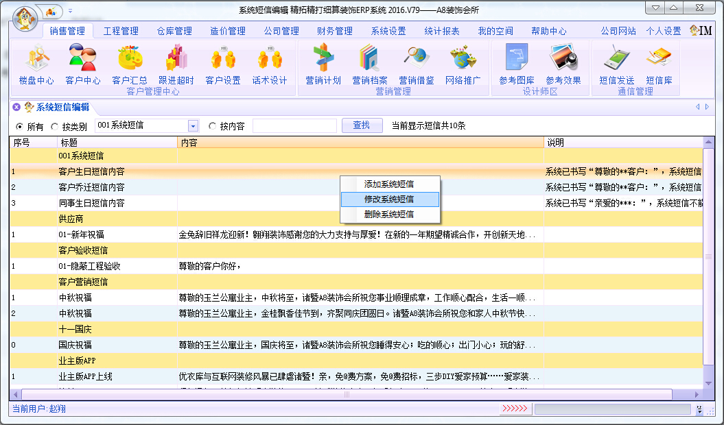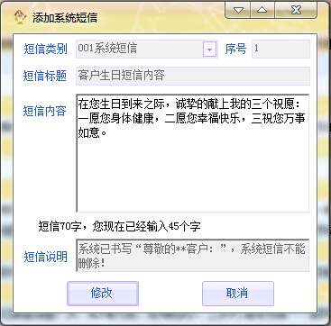 右鍵“修改系統(tǒng)短信”001系統(tǒng)短信是只能修改的,無(wú)法刪除,但是在啟用ERP的第一時(shí)間應(yīng)該要修改好這3個(gè)系統(tǒng)短信的內(nèi)容。